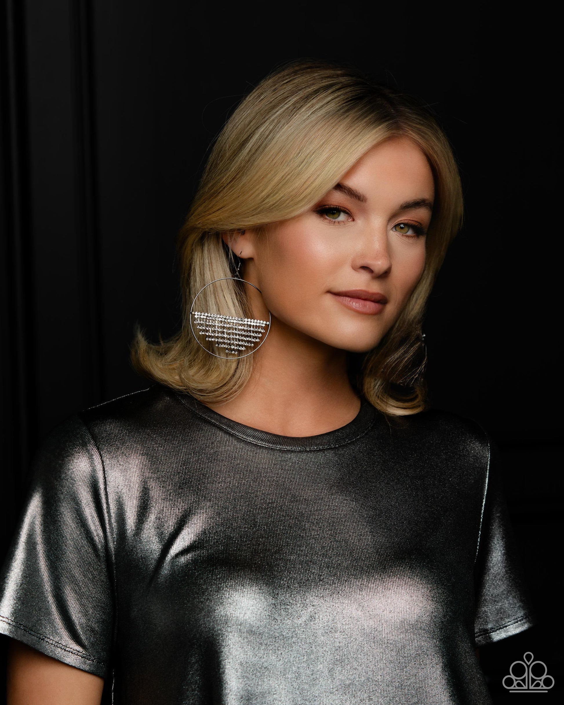 An exquisite arrangement of bold black beads elegantly cascades along a sleek, oversized matte hoop, crafting an eye-catching allure. The beads gracefully converge towards the center, swaying and shimmering to enhance the dynamic movement for an electrifying party spirit. Earrings are designed with a classic fishhook fitting for effortless styling.