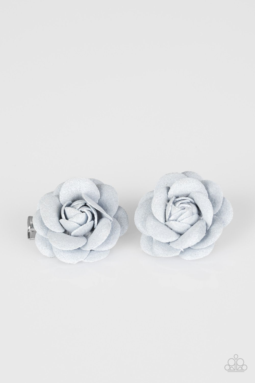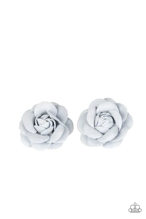Brushed in a blue finish, paper-like petals bloom into a pair of dainty blossoms for a seasonal look. Each flower features a standard hair clip on the back. Sold as one individual hair clip.
