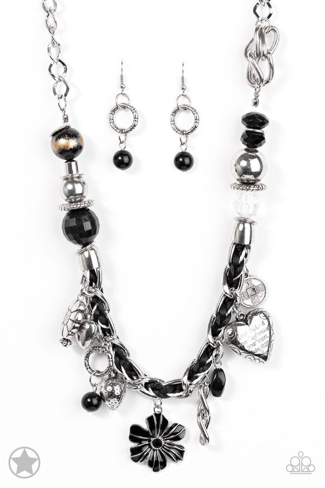 Introducing the stunning Paparazzi Necklace - Charmed, I am Sure - Black. This exquisite piece features black and ivory cording braided through a chunky silver chain, adding a touch of elegance to any outfit. The necklace is adorned with a variety of unique charms, including a delicate flower and a heart inscribed with the phrase "With All My Heart" and a bible verse on the other side that reads, "Love the Lord thy God with all your heart. Luke 10:27." The adjustable clasp closure ensures a perfect fit. This gorgeous necklace comes with a matching pair of earrings, making it a complete set for any occasion.
