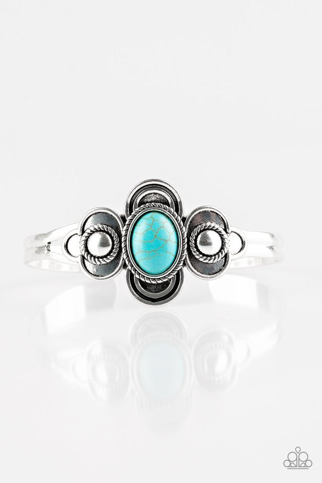 Introducing the stunning Dream COWGIRL -Blue Paparazzi Bracelet, featuring a refreshing turquoise stone set in a dainty silver cuff with textured silver frames, perfect for the season. This stylish bracelet is sold individually and adds a touch of elegance to any outfit with its unique design. Elevate your look with this eye-catching piece that effortlessly combines bold style with timeless sophistication. Available now in our Blue Paparazzi collection, perfect for pairing with other coordinating pieces such as bracelets, earrings, and necklaces. Add this must-have accessory to your collection today and make a statement wherever you go.