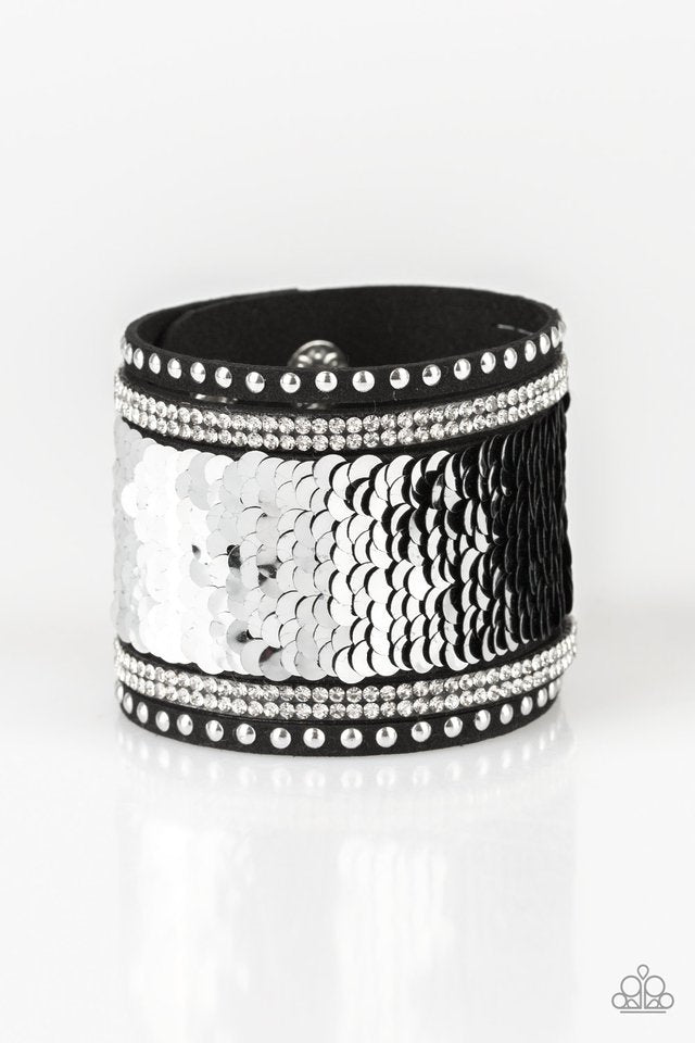 Step into the enchanting world of mermaids with our **shimmering sequin**, and **glassy white rhinestone** adorned MERMAIDS Have More Fun - Black Paparazzi Bracelet. The thick black suede band, accented with **shiny silver studs**, is spliced into five glittery rows, adding a touch of glamour to any outfit. The **reversible sequins** have a captivating feature that changes from black to silver. With an **adjustable snap closure**, this bracelet is perfect for adding a touch of ocean-inspired elegance to any look. Make a splash with our MERMAIDS Have More Fun - Black Paparazzi Bracelet. Sold as one individual bracelet.