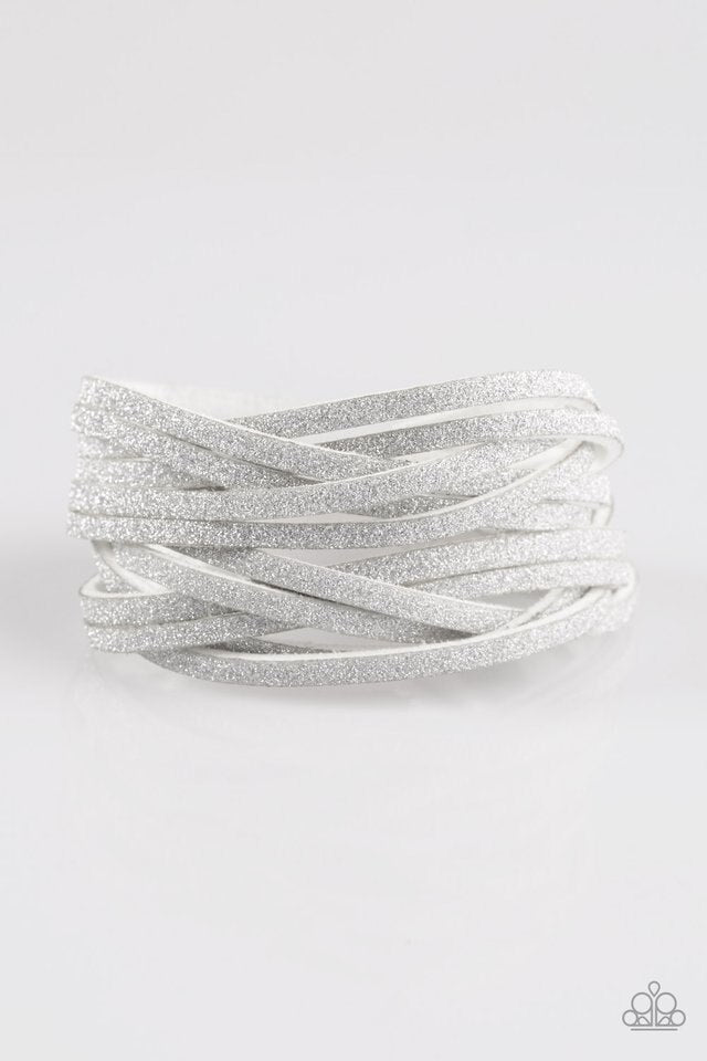 Introducing the stunning Shameless Shimmer bracelet in a dazzling white color. This exquisite accessory is dusted with a silvery shimmer that catches the light and adds an air of elegance to any outfit. The strands of white suede crisscross and braid across the wrist, creating a beautiful glittery effect. The elongated band allows for a trendy double wrap design, giving it a modern and chic appeal. The adjustable snap closure ensures a comfortable fit for all wrist sizes, making it a versatile accessory for any occasion. Add a touch of bracelet to your jewelry collection with the Paparazzi Shameless Shimmer bracelet. Sold as one individual bracelet.