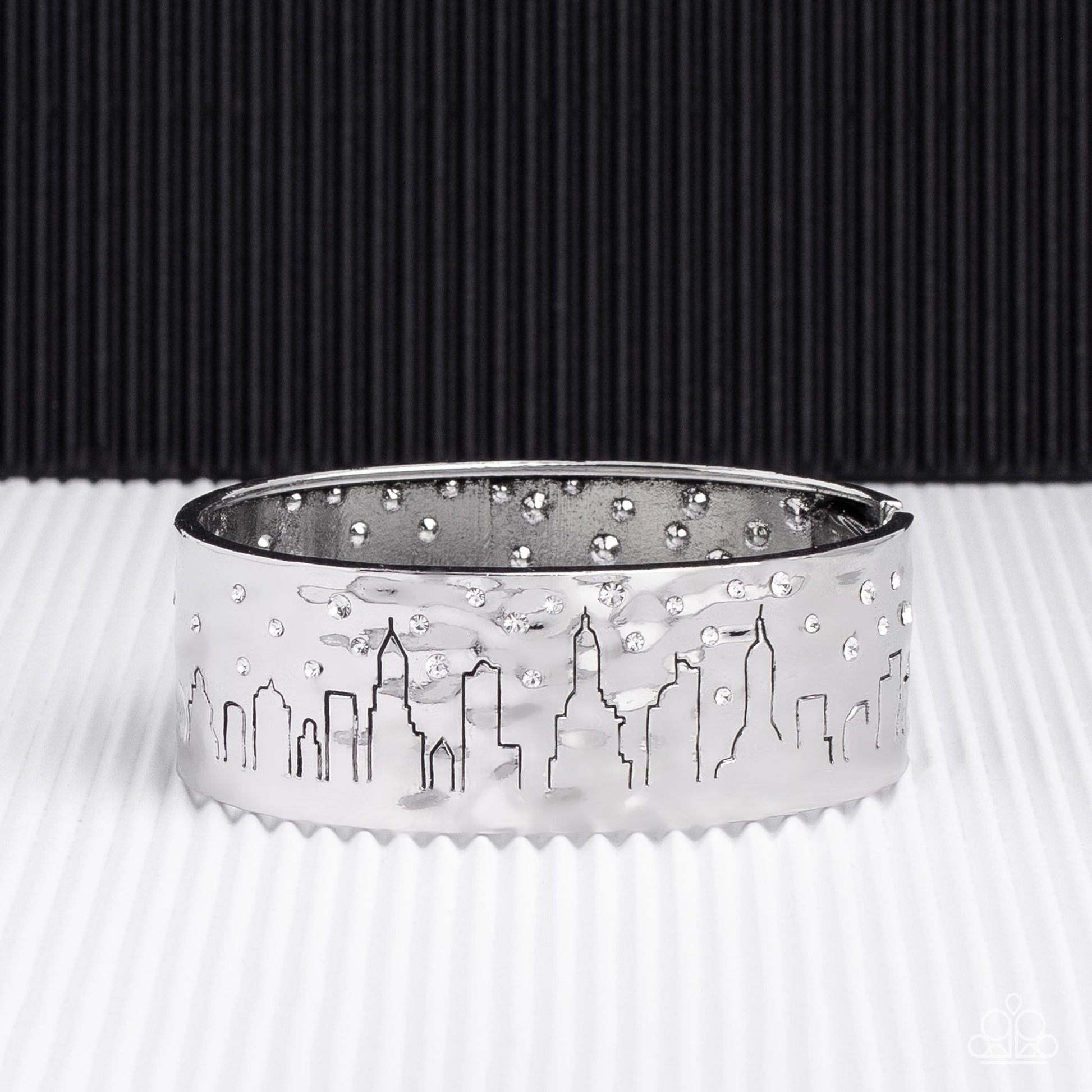 Glittery white rhinestones twinkle like stars along the front of two hammered silver frames that delicately hinge into an adjustable bangle-like bracelet. Outlines of towering skyscrapers are stamped into the frames, creating a sweeping cityscape. Features a hinged closure.