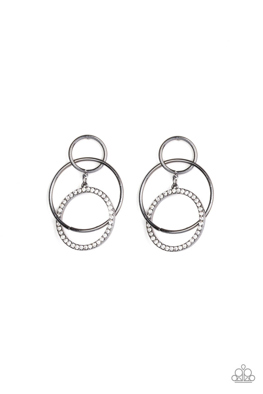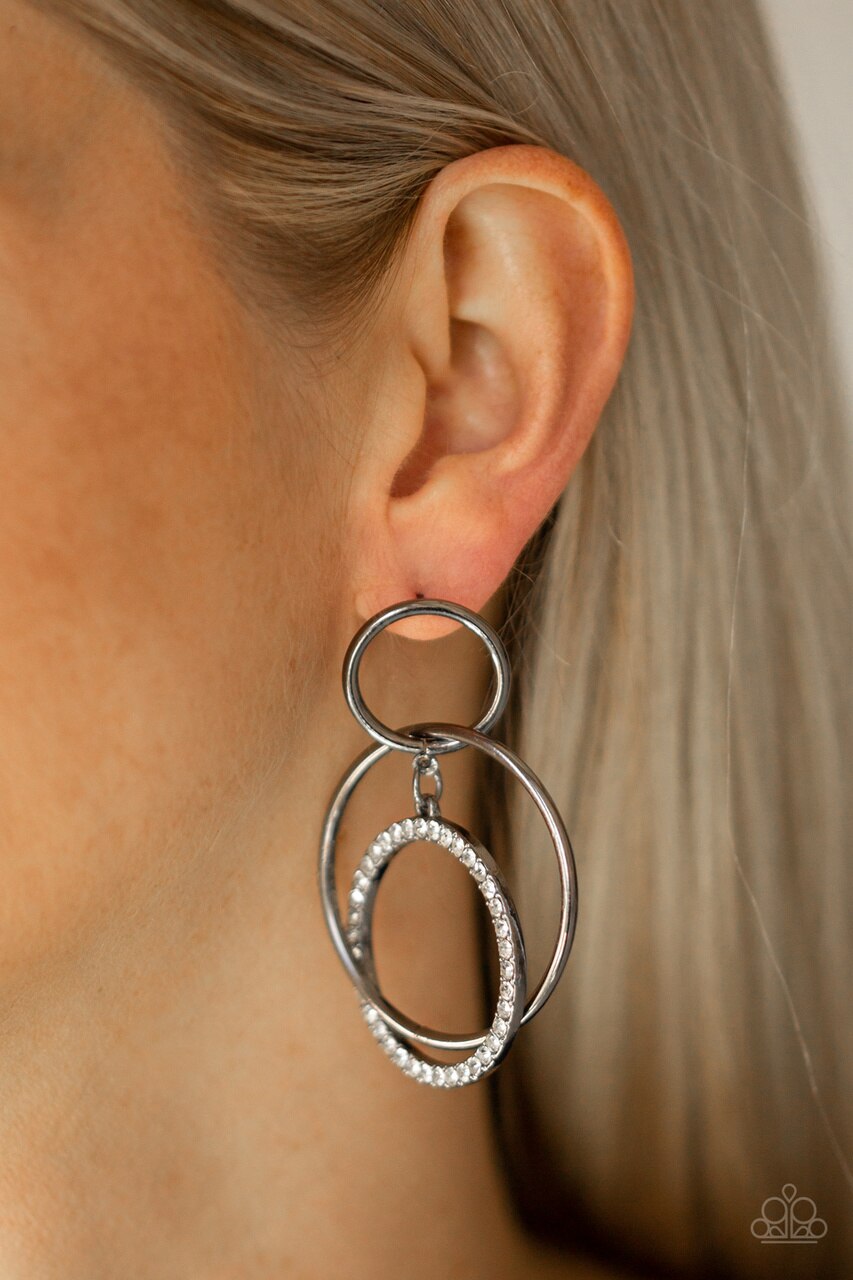 Introducing the Metro Bliss Earrings in stunning Gunmetal! These earrings feature a glistening gunmetal hoop encrusted in a ring of blinding white rhinestones, with a larger gunmetal hoop threaded through the centers for a modern finish. The earrings attach to a standard post fitting.
