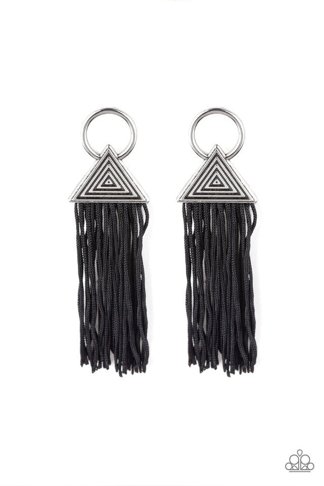 Discover the mesmerizing appeal of the Oh My GIZA Earrings in Shiny black. These statement earrings feature a chic triangular frame with tasseled black cording, adding a touch of drama to any outfit. The earrings attach with a standard post fitting, making them comfortable and easy to wear. Sold as one pair of post earrings, these Oh My GIZA Earrings are the perfect addition to your jewelry collection. Elevate your look with these stunning earrings that are sure to turn heads.