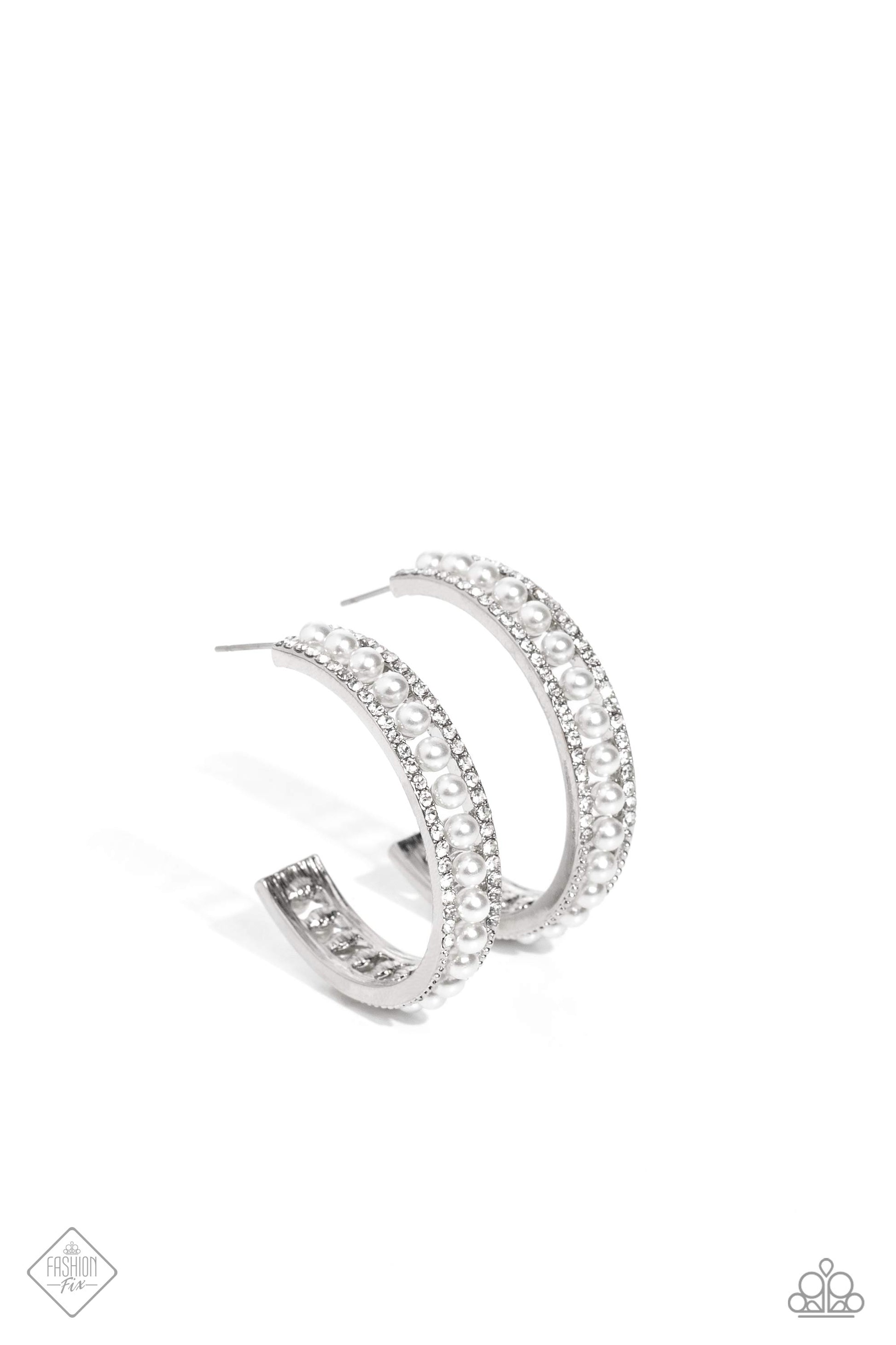 A stunning array of lustrous white pearls beautifully accents dazzling silver bands studded with sparkling rhinestones, gracefully embracing the ear to create a captivating hoop shape. These earrings feature a secure post backing for easy wear. With a diameter of around 1 1/2 inches, they infuse an air of elegance into any look. Available as a matching pair.