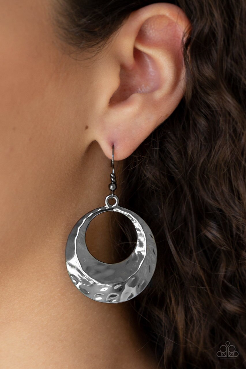 Introducing the **Savory Shimmer - Black** paparazzi earring, crafted with a high-sheen finish that accentuates the beveled gunmetal hoop, creating a casual yet stylish shine. The earring attaches easily to your ears with a standard fishhook fitting, providing comfort and ease of wear.