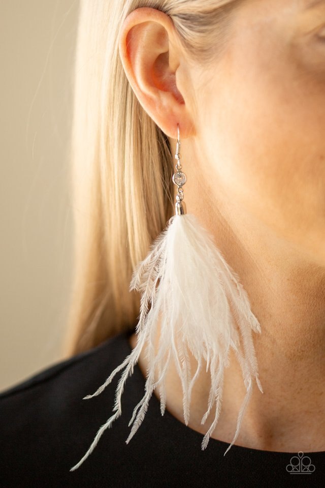 Introducing the Showgirl Next Door - White Paparazzi Earrings! These stunning earrings feature a delicate frame adorned with a soft plume of white feathers, creating a playful and flirtatious fringe. The earrings attach with a standard fishhook fitting, adding a touch of elegance to any outfit.