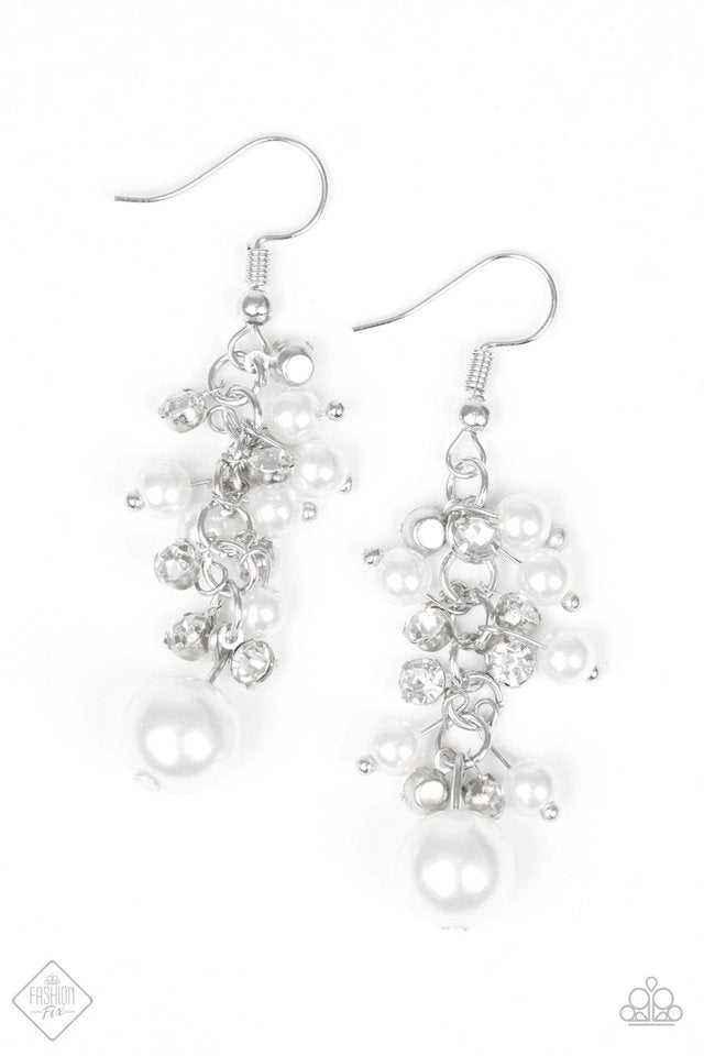 Introducing the stunning Paparazzi Earrings - Classy Crescendo - White! These exquisite earrings feature delicate white pearls and dazzling white rhinestones cascading down a glistening silver chain. The sparkling fringe leads to a captivating white pearl, creating a timeless chandelier effect. These earrings are the perfect accessory for any formal event or special occasion. Earring attaches to a standard fishhook fitting for easy wear. Sold as one pair of earrings. Elevate your outfit with these glamorous Paparazzi Earrings - Classy Crescendo - White today! Available now in our White Paparazzi Jewelry collection.
