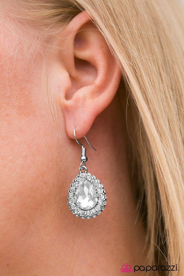 A glassy white teardrop is encrusted with two rows of dainty white rhinestones. The shimmering teardrop swings from the ear in a refined fashion. Earring attaches to a standard fishhook fitting.