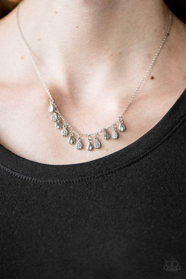 Indulge in the elegance of this stunning Paparazzi Necklace - A Storm Is Coming - White. Delicate silver and white rhinestones adorn the teardrop-shaped accents, creating a mesmerizing effect that will complement any outfit. The shimmery silver chain adds a touch of glamour, while the adjustable clasp closure ensures a perfect fit for every neckline. This necklace is sold as a single piece and comes with a pair of matching earrings, making it a versatile addition to your jewelry collection. Whether you're dressing up for a special occasion or adding a hint of sparkle to your everyday look, this necklace is the perfect accessory to make a statement. Elevate your style with the Paparazzi Necklace - A Storm Is Coming - White and experience the beauty of timeless elegance. Add it to your collection today and feel the confidence that comes with wearing stunning jewelry. Check out our full range of white Paparazzi jewelry to find the perfect pieces to pair with this necklace. Whether you're looking for bracelets, earrings, necklaces, or rings, we have everything you need to complete your ensemble.