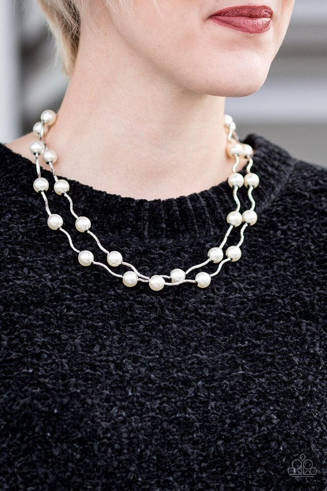 Introducing the Paparazzi Necklace - Ahead Of The FAME - White! Embrace elegance with this stunning piece featuring layers of lustrous white pearls and wavy silver beading. The adjustable clasp closure ensures a perfect fit while exuding timeless sophistication. This necklace comes with a matching pair of earrings for a complete look.