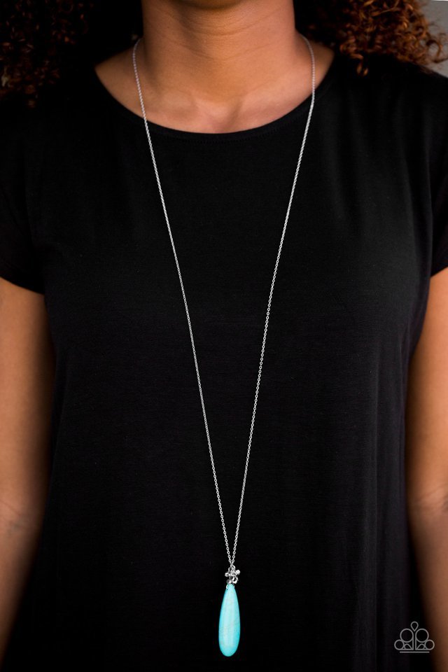 Introducing the stunning Paparazzi Necklace - Canyon Craze - Blue, featuring a tranquil teardrop-shaped turquoise stone hanging from a sleek silver chain. The earthy pendant is accented by delicate silver cube beading, adding a touch of metallic shimmer to the design. With an adjustable clasp closure, this necklace is perfect for the season.