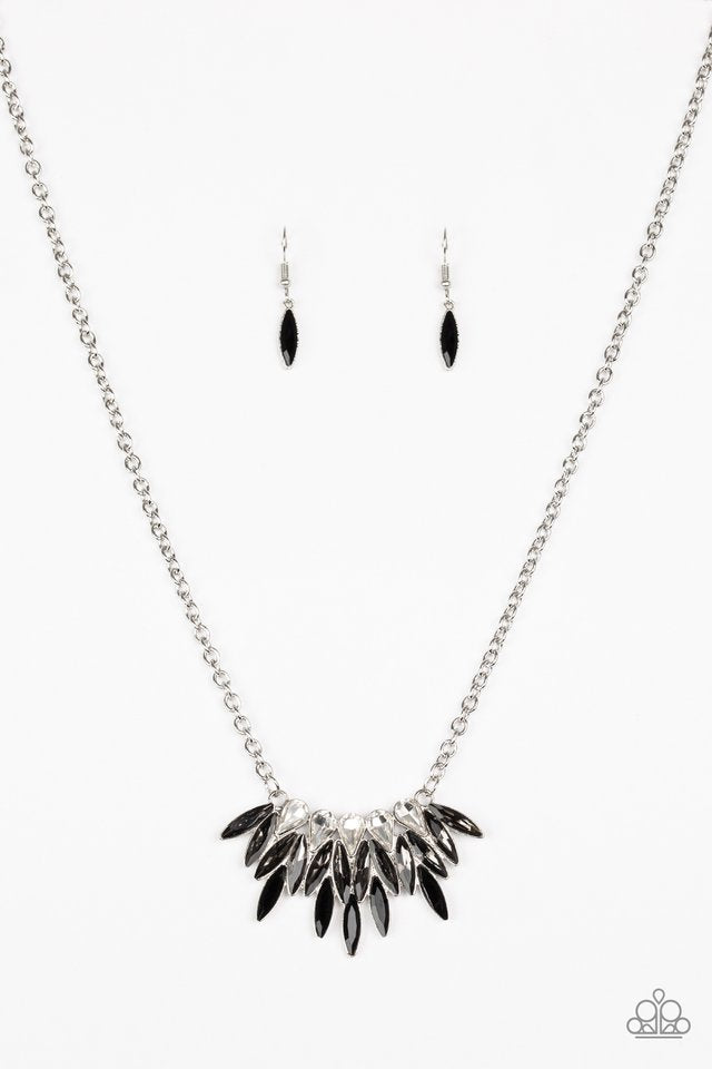 Introducing our stunning Paparazzi Necklace - Crown Couture in a sleek black color. This necklace features a luxurious design with regal teardrop and marquise style cuts, adorned with glittery white, smoky gray, and glassy black rhinestones that drape elegantly below the collar for a truly dramatic look. The adjustable clasp closure ensures a perfect fit for any neckline.