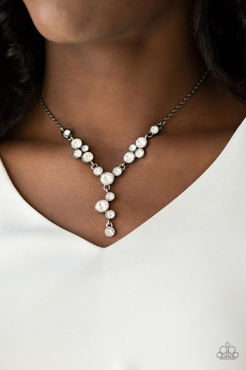 Introducing the Five-Star Starlet - Black paparazzi necklace. Glistening white rhinestones are encased in sleek gunmetal frames, creating a stunning statement piece that drips with glamour. The extended pendant adds a touch of sophistication, making this necklace the perfect accessory for any special occasion.