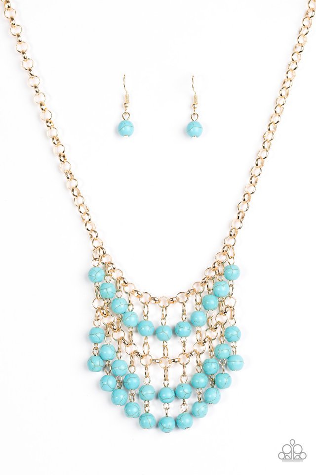 Introducing the stunning Paparazzi Necklace - Jurassic Park Party in a luxurious gold finish. This exquisite piece features refreshing turquoise stone beads that gracefully swing from a netted gold chain, creating a bold artisanal fringe that will dazzle and captivate anyone. The necklace comes with an adjustable clasp closure for a perfect fit. Sold as one individual necklace and includes a pair of matching earrings for a complete and sophisticated look. Make a statement and stand out with this exquisite Paparazzi Necklace - Jurassic Park Party - Gold. Elevate your style and add a touch of elegance to any outfit with this unique and eye-catching accessory that will surely turn heads. Make a bold fashion statement and express your individuality with this exquisite Paparazzi Necklace - Jurassic Park Party - Gold.