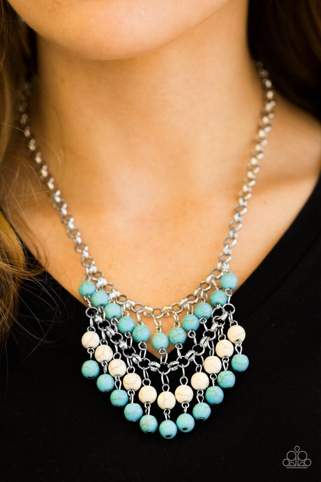 Introducing the stunning Paparazzi Necklace - Jurassic Park Party - Multi, featuring a beautiful combination of refreshing turquoise and white stone beads. These beads are delicately arranged on a netted silver chain to create a bold artisanal fringe that elegantly adorns the collar. The necklace comes with an adjustable clasp closure for a comfortable fit.
