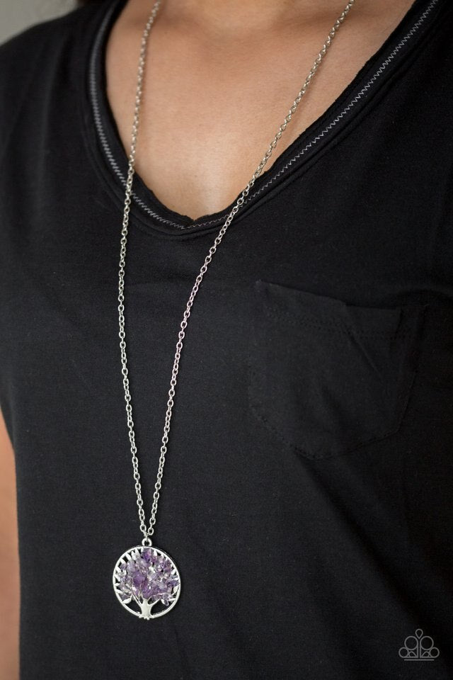 Introducing our stunning Naturally Nirvana necklace in Purple. This exquisite piece features a shimmery silver tree pendant adorned with bits of purple rock, creating a beautiful and colorful leaf design. The necklace comes with an adjustable clasp closure for the perfect fit. Sold individually, it also includes a pair of matching earrings. Elevate your style with this elegant and vibrant accessory that will add a touch of nature-inspired beauty to any outfit. Experience the enchanting allure of our Naturally Nirvana necklace in Purple today.