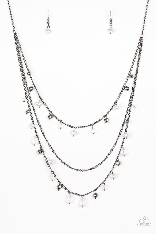 Introducing the Paparazzi Necklace - Pebble Beach Party - Black! This exquisite piece features faceted gunmetal and crystal-like beads paired with pearly white pebbles, all positioned along glistening gunmetal chains. A refined layering effect creates a stunning look across the chest, and the adjustable clasp closure ensures the perfect fit.
