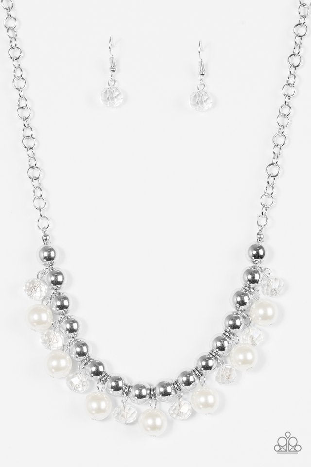 Embrace the power of elegance with the Paparazzi Necklace - Power Trip - White. A bold silver chain holds classic silver beads threaded along a skinny wire, creating a stunning look. Pearly white and faceted crystal-like beads dangle from the silver beads, forming a refined fringe that exudes sophistication and charm. The adjustable clasp closure ensures a perfect fit.