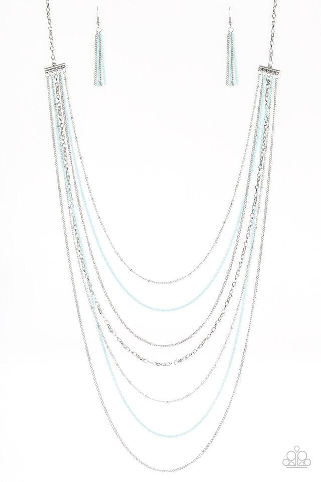Introducing the dazzling "Radical Rainbows - Blue" Paparazzi Necklace! This stunning piece features mismatched silver chains alternating with delicate blue chains, creating a colorful and industrial look that is sure to turn heads. The necklace also includes an adjustable clasp closure for a perfect fit. Sold as one individual necklace, this set also comes with a pair of matching earrings for a complete and coordinated look.