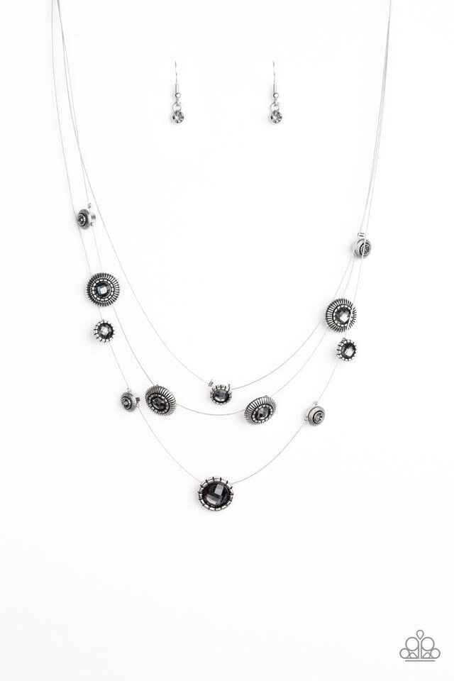 Introducing the SHEER Thing! Paparazzi Necklace in Silver. Adorned with **dotted smoky rhinestone centers**, this beautiful piece features an array of ornate silver frames that delicately trickle along skinny silver wires, adding a whimsical flair to any outfit. The necklace also includes an adjustable clasp closure for a perfect fit.