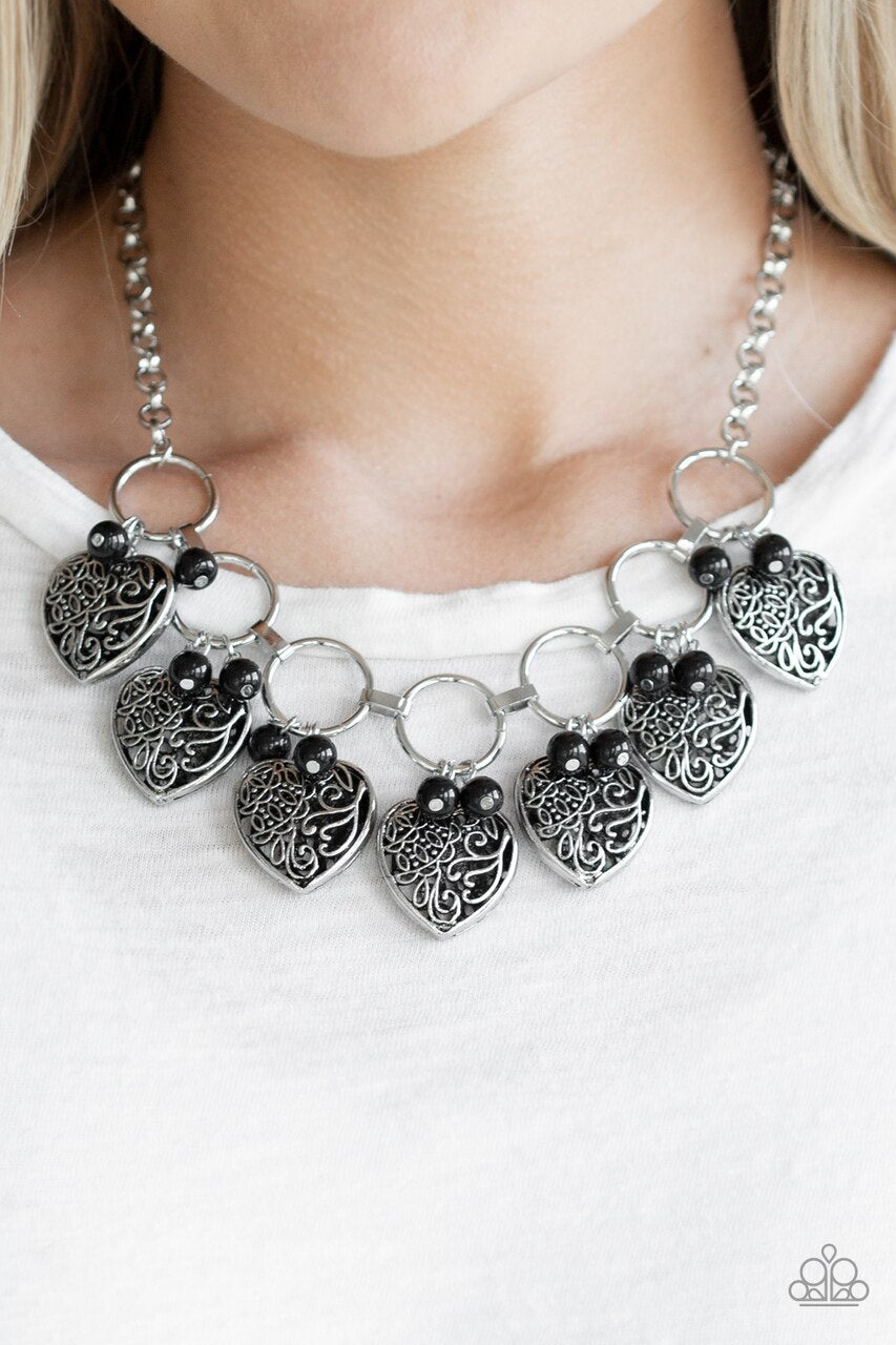 With its bold black beads and vintage-inspired heart frames, this Very Valentine necklace in Black is the perfect accessory to add a touch of elegance to any outfit. The adjustable clasp closure ensures a comfortable fit, while the matching earrings complete the look. Elevate your style with this stunning paparazzi jewelry set.