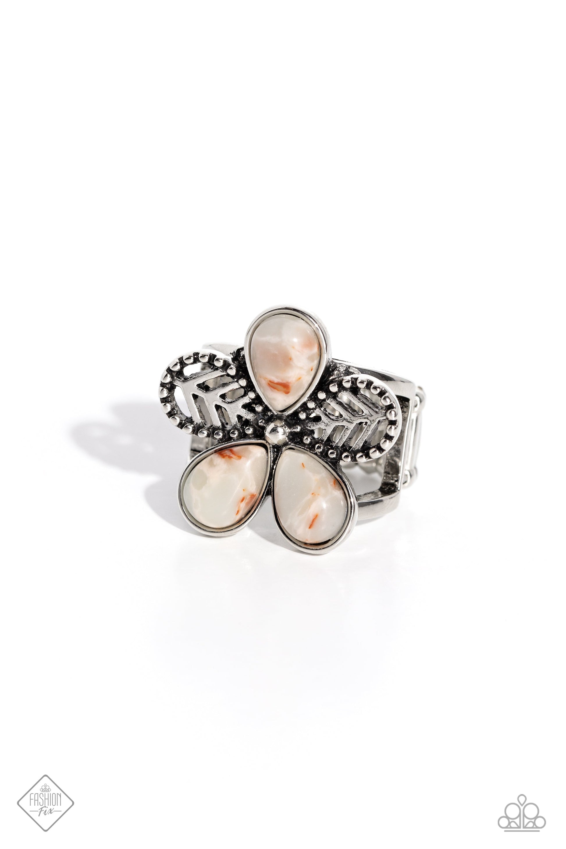 Whimsical charm defines this captivating ring, showcasing playful silver bands that embrace textured silver petals paired with striking azure stone accents. This charming focal point rests elegantly on your finger, effortlessly turning heads while providing a flexible band for maximum comfort and style. Each piece displays unique variations in stone hue, highlighting its natural beauty. Available as a single ring.